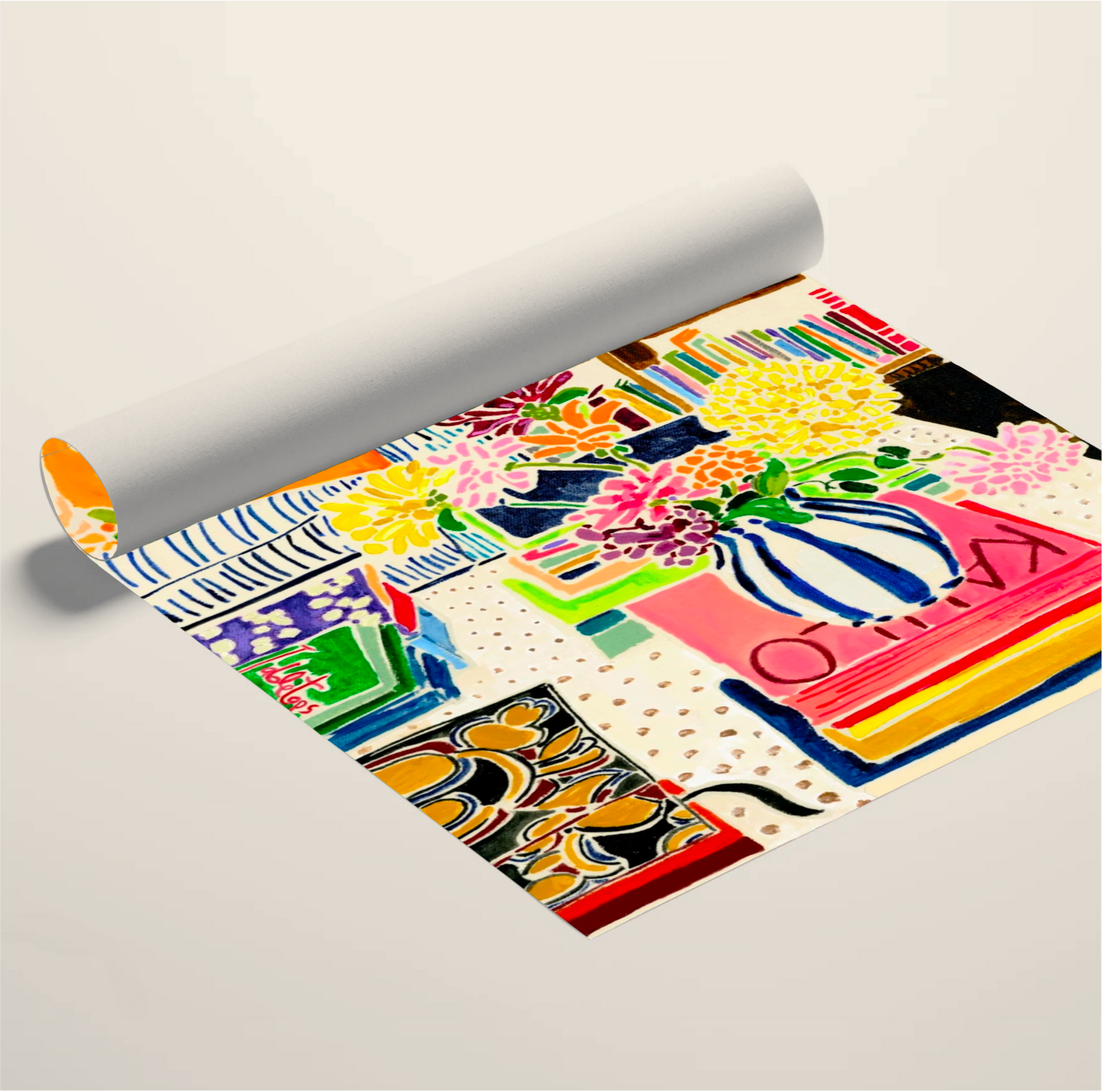 Bold dahlias spill from a striped vase, resting atop colorful stacks of books in a room full of pattern and life. Dahlias in Striped Vase is a celebration of gathered blooms, layered color, and the everyday beauty of home.