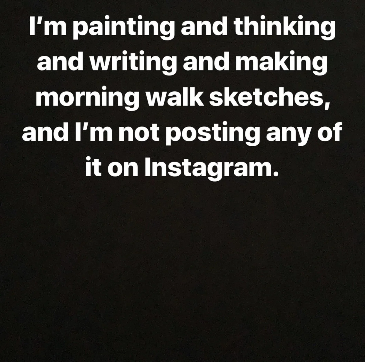 I’m painting and thinking and writing and making morning walk sketches, and I’m not posting any of it on Instagram. I’m not even looking at Instagram. In fact, three weeks ago, I deleted the app from my phone. I also deleted Facebook and Pinterest. Currently, I have almost no digital visual input. And, it feels so liberating.